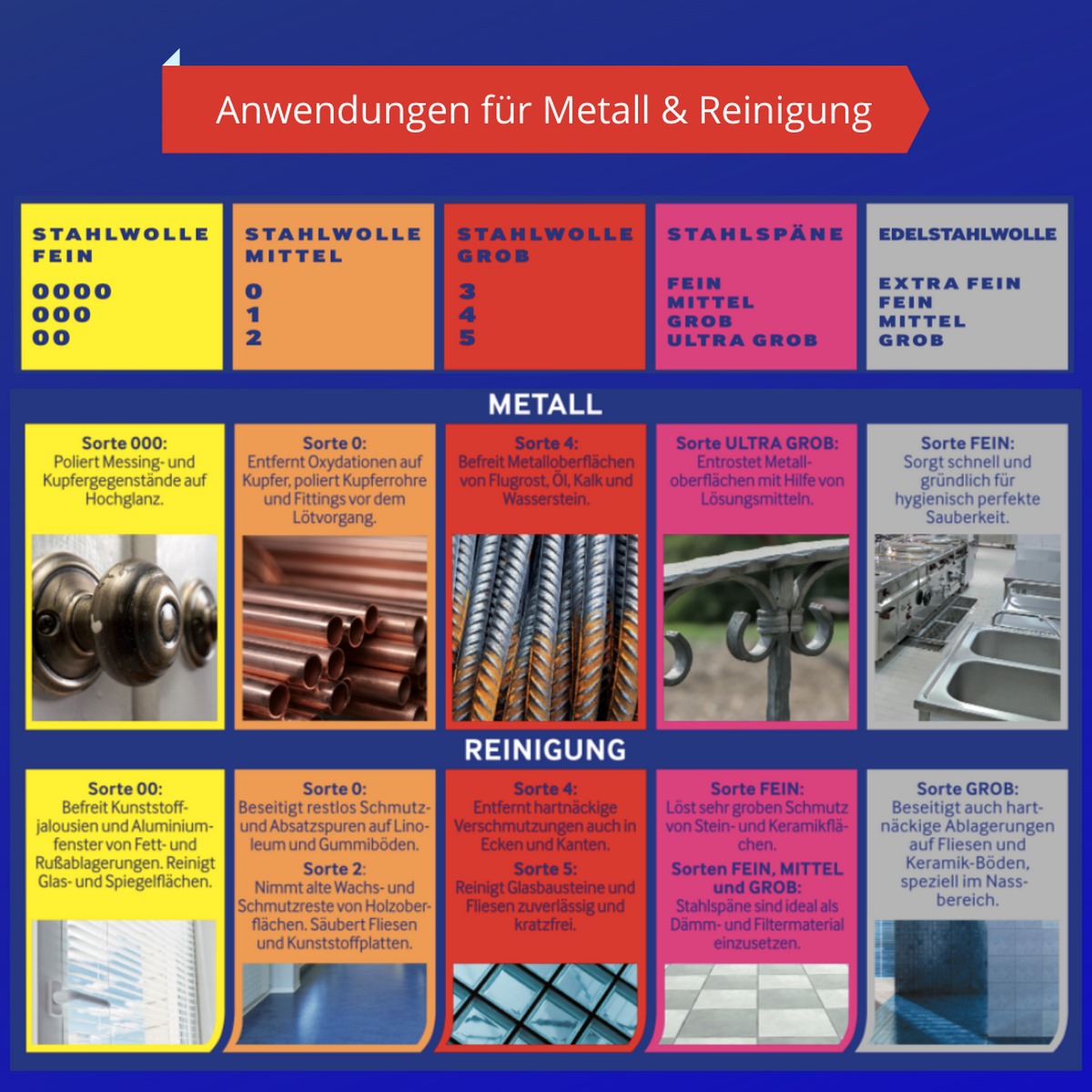 Mit den feinen Sorten Nr. 0000, 000, 00 können Sie z.B. Hölzer nach dem Beizen glätten, gewachste Hölzer mit neuem Wachs aufpolieren, Kunststoffjalousien und Gartenmöbel gründlich und schonend reinigen sowie Aluminium, Kupfer und Messing aufpolieren.
