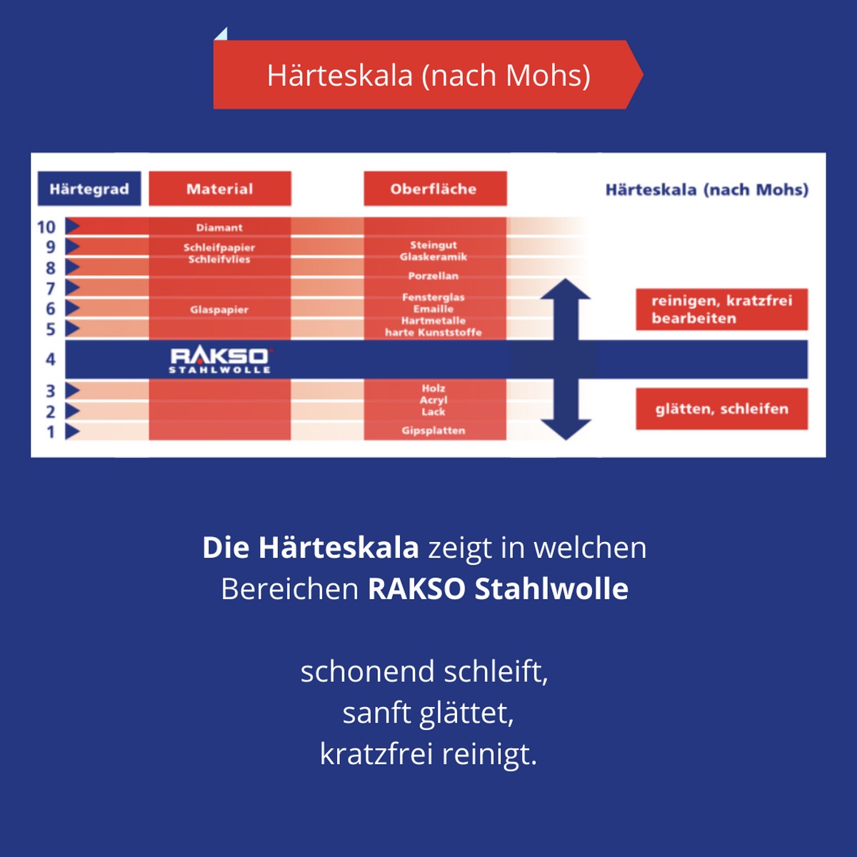 - Das Universalprodukt zum Polieren, Schleifen, Reinigen verschiedenster Oberflächen, wie Holz, Metall, Glas, Stein. Erhältlich in 9 Feinheitsgraden von extrafein 0000 bis ultragrob 5. RAKSO Stahlwolle elastisch, flexibel, garantiert kratzfrei.