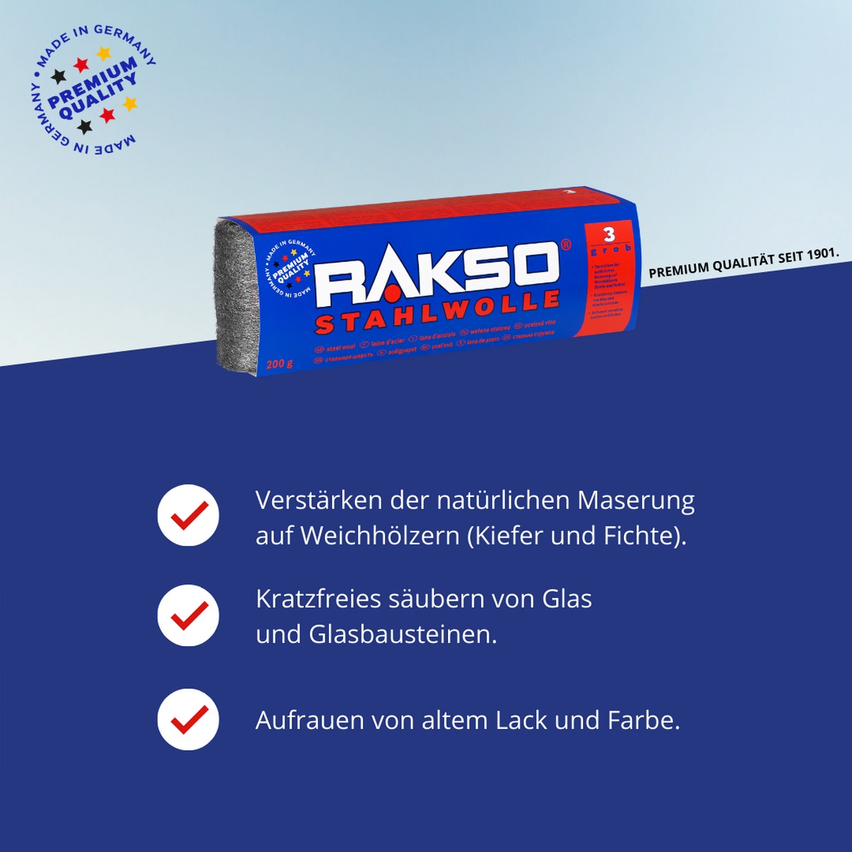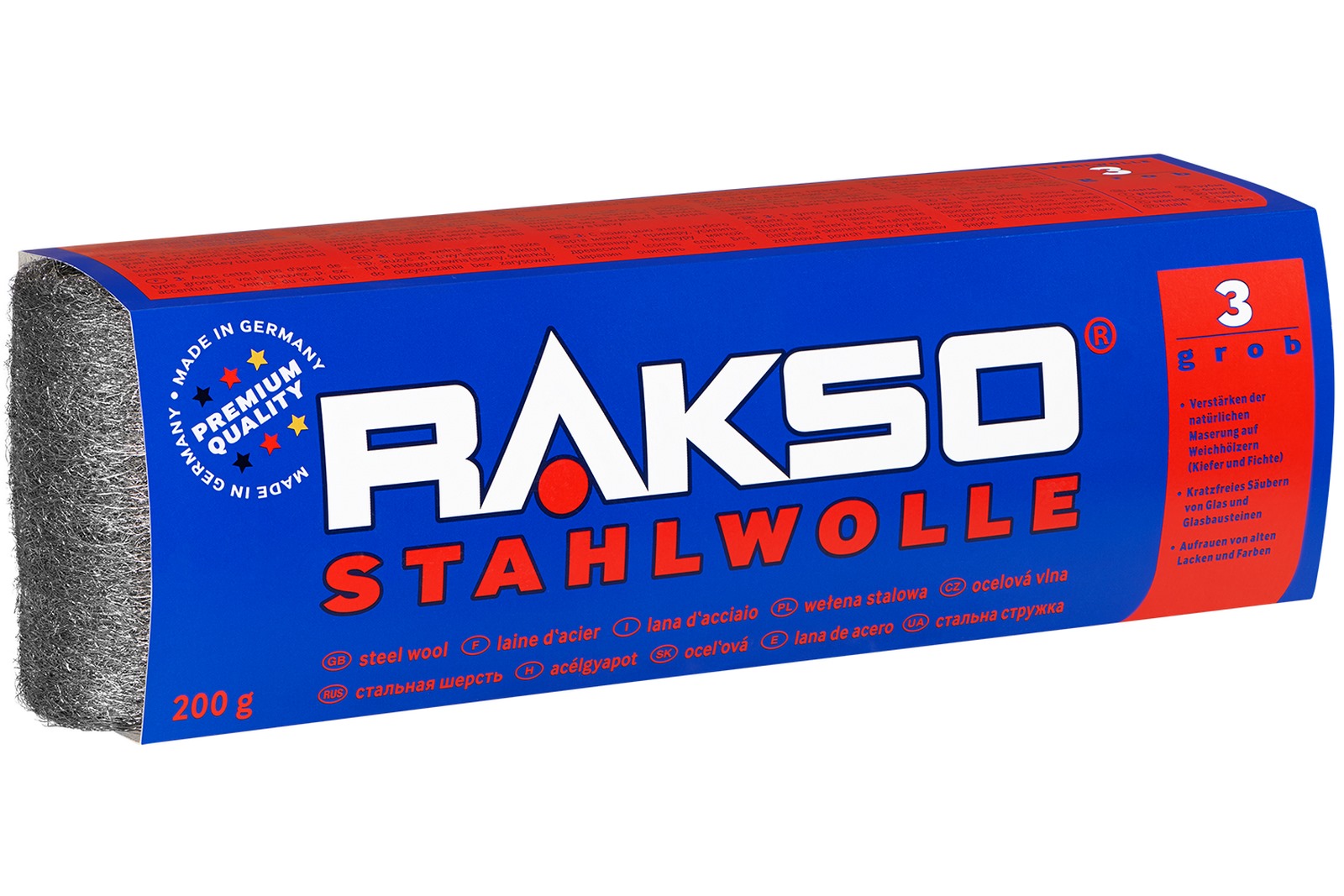 - RAKSO Stahlwolle grob 3: Schleift grundierte Hölzer & betont so die natürliche Oberflächenstruktur. Aufrauen von alten Lacken & Farben. Säubert Glas, Glasbausteine garantiert kratzfrei. Praktische Banderole - einfach zuzuschneiden.
