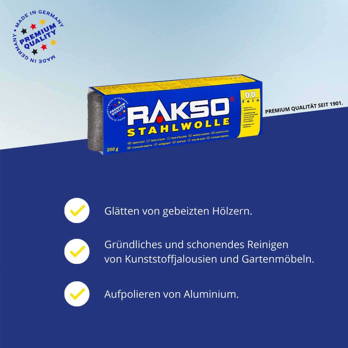 - RAKSO ist die Nr.1 für Stahlwolle in Deutschland/Europa. Premium-Qualität Made in Germany seit 1901. Die Marke RAKSO steht für innovative Lösungen bei der Oberflächenbehandlung und Reinigung, hergestellt aus hochwertigem Gütestahl.