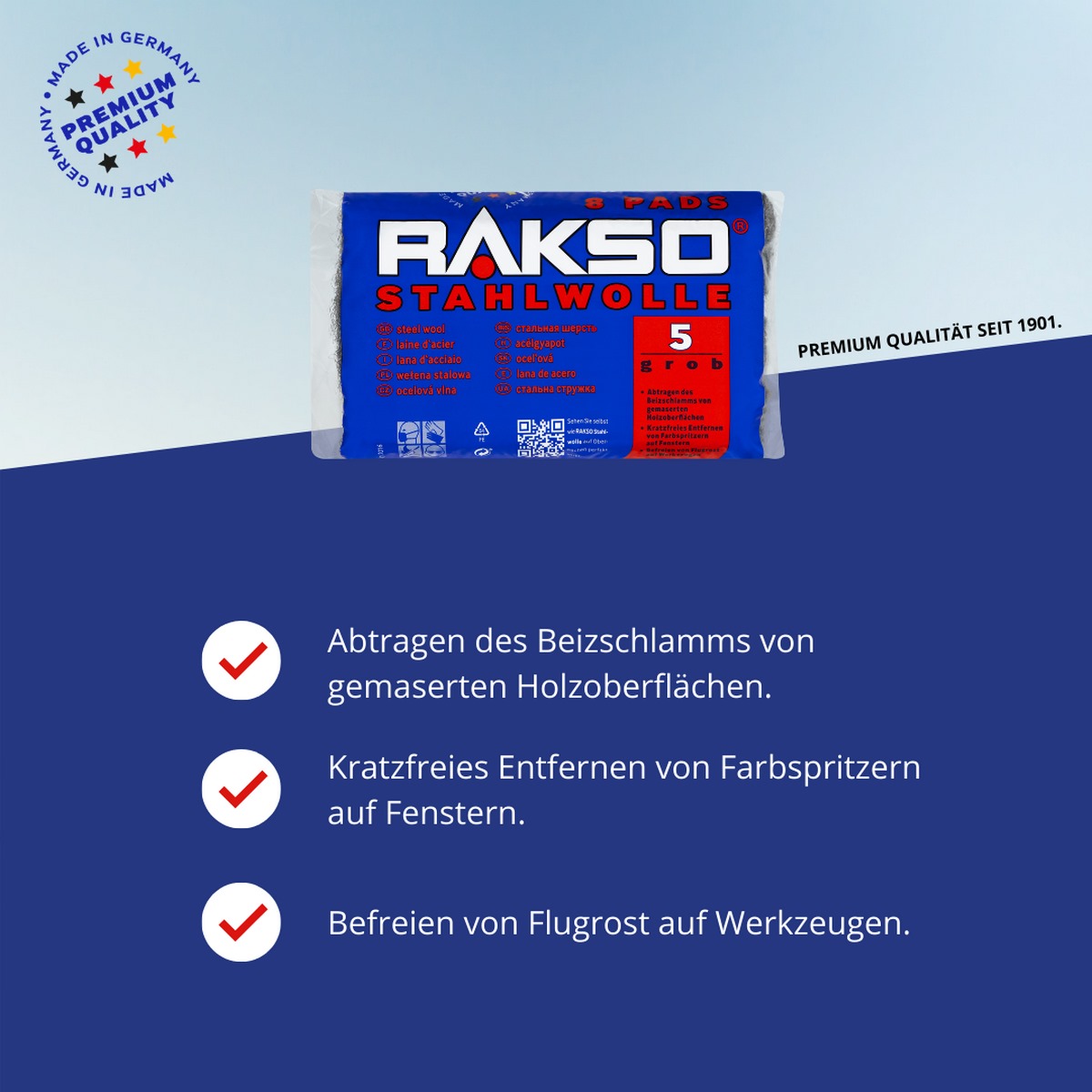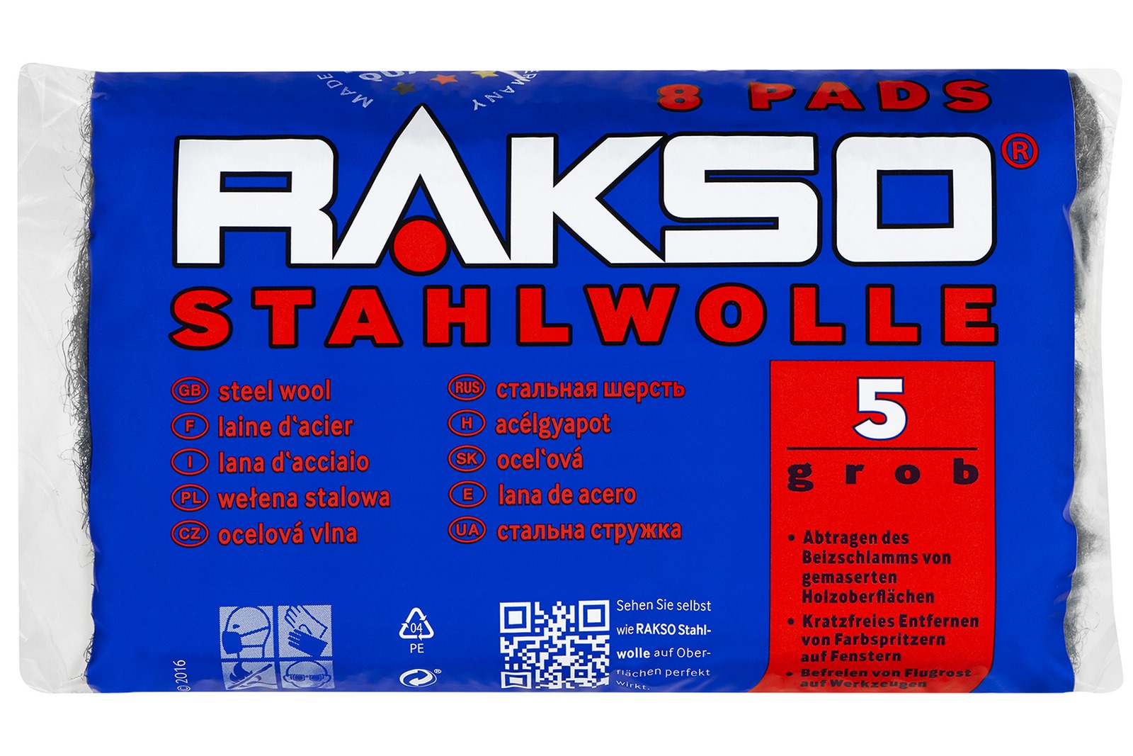 - RAKSO Stahlwolle grob 5: Entfernt nach Abbeizen von Holzoberflächen Beizschlamm. Raut alte Farbe vor Neuanstrich auf. Reinigt Glasbausteine, Fliesen. Entfernt Farbspritzer. Befreit Flugrost auf Werkzeugen. Handliches Kissen - sofort einsatzbereit.
