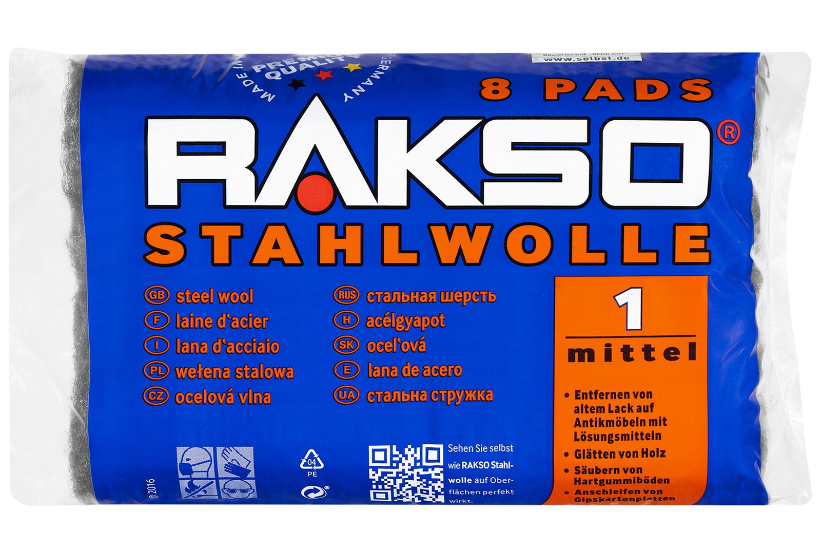 - Die RAKSO Stahlwolle Pads erhältlich in 3 mittleren Sorten 0, 1, 2. Anwendung: Glättet Holz nach Grundierung, entfernt alte Lacke mit Lösungsmitteln & Schmutz von Kacheln, Steinböden, poliert Kupferrohre, Fittings vor dem Löten, schleift Gipskartonplatten an.