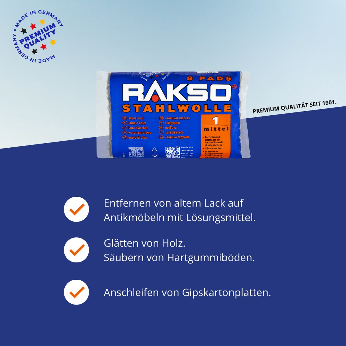 - RAKSO Stahlwolle mittel 1: Schleift, glättet Holzoberflächen nach dem Grundieren & vor dem neuen Farbauftrag. Entfernt mithilfe von Lackentferner alten Lack von Antikmöbeln. Säubert Hartgummiböden. Handliches Kissenformat - sofort einsatzbereit.