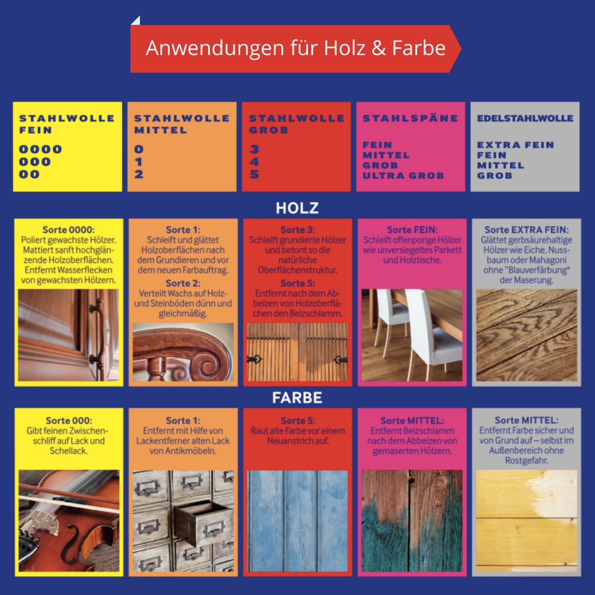 Mit den feinen Sorten Nr. 0000, 000, 00 können Sie z.B. Hölzer nach dem Beizen glätten, gewachste Hölzer mit neuem Wachs aufpolieren, Kunststoffjalousien und Gartenmöbel gründlich und schonend reinigen sowie Aluminium, Kupfer und Messing aufpolieren