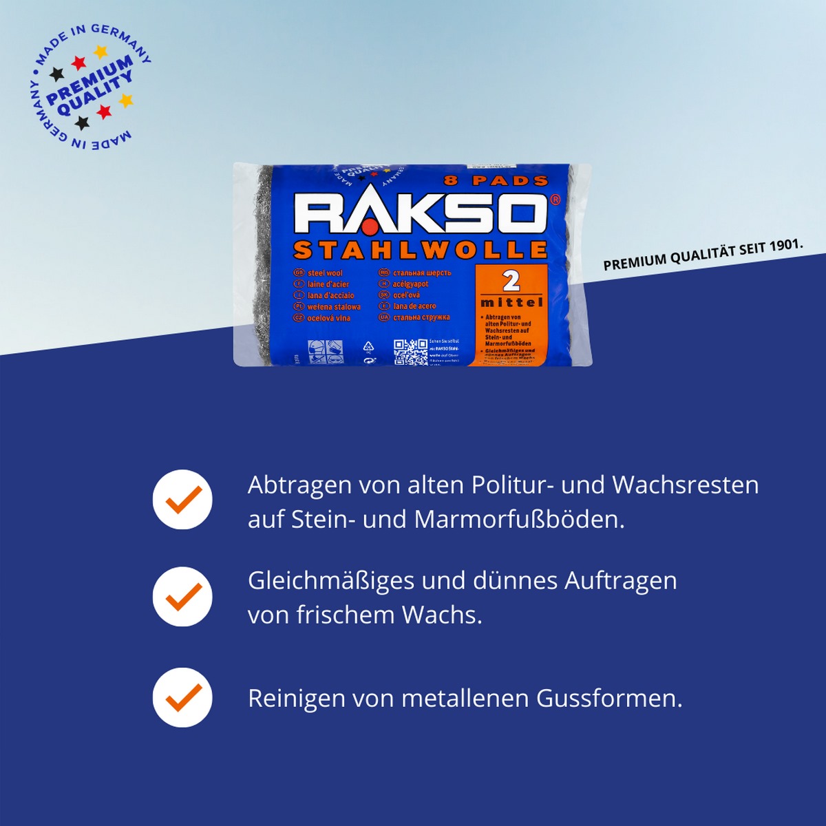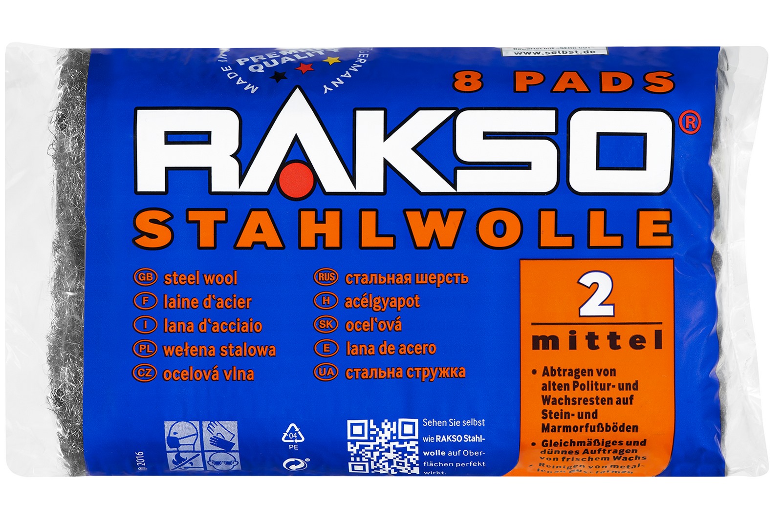 - RAKSO Stahlwolle mittel 2: Nimmt alte Wachs- & Schmutzreste von Holzoberflächen. Säubert Fliesen, Kunststoffplatten. Verteilt Wachs auf Steinböden dünn, gleichmäßig. Reinigt metallene Gussformen. Handliches Kissenformat - sofort einsatzbereit.